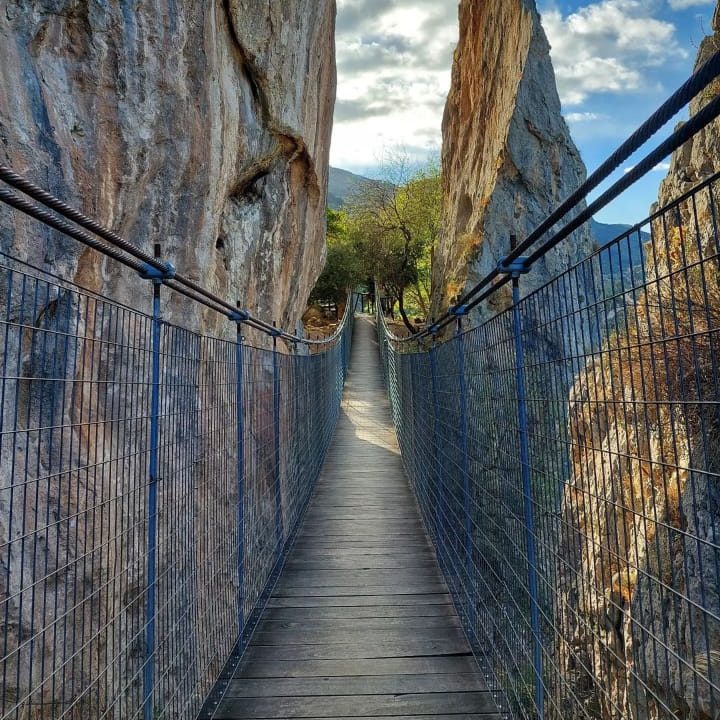 El puente colgante de Zuheros se encuentra suspendido entre paredes rocosas y rodeado de vegetación típica de la subbética. Aunque no es muy largo, al cruzarlo se siente la emoción del equilibrio bajo sobre los pies y la belleza del paisaje a ambos lados.